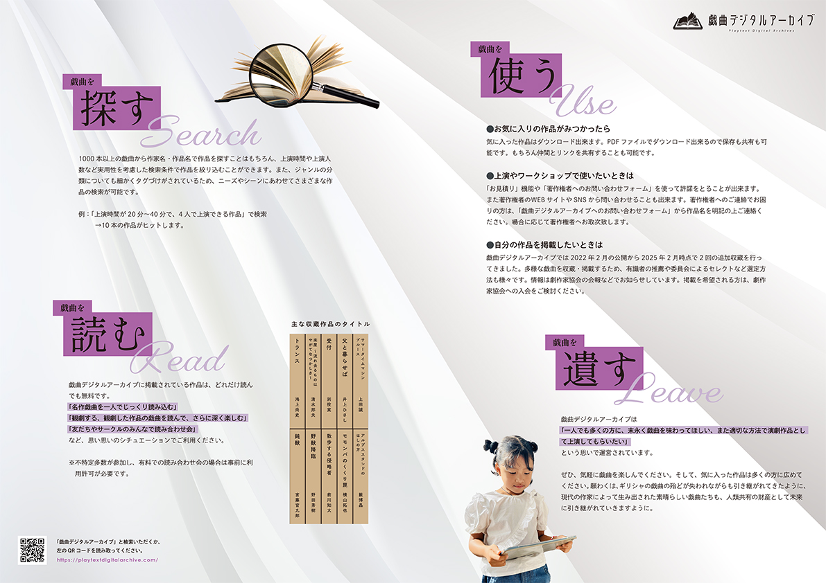 戯曲デジタルアーカイブは「一人でも多くの方に、末永く戯曲を味わってほしい、また適切な方法で演劇作品として上演してもらいたい」という思いで運営されています。