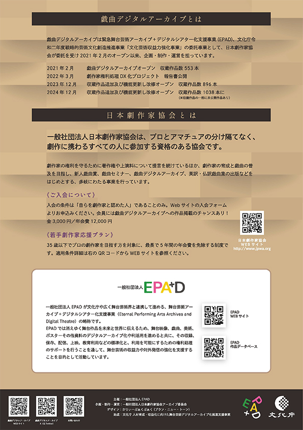 「戯曲デジタルアーカイブ」は緊急舞台芸術アーカイブ+デジタルシアター化支援事業(EPAD)、文化庁令和二年度戦略的芸術文化創造推進事業「文化芸術収益力強化事業」の委託事業として、日本劇作家協会が企画・制作・運営しています。