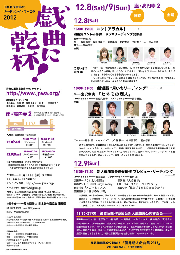 主催:一般社団法人 日本劇作家協会 後援:公益財団法人 一ツ橋綜合財団 / 杉並区 [協力] NPO法人 劇場創造ネットワーク/座・高円寺