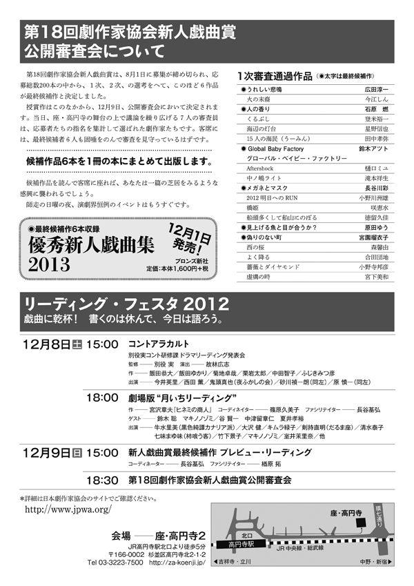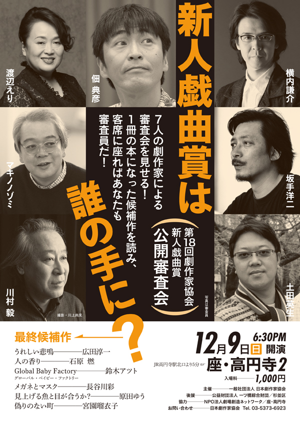 文化庁委託事業「平成24年度 次代の文化を創造する新進芸術家育成事業」 主催:文化庁/一般社団法人 日本劇作家協会 制作:一般社団法人 日本劇作家協会 後援:杉並区 第18回劇作家協会新人戯曲賞公開審査会
